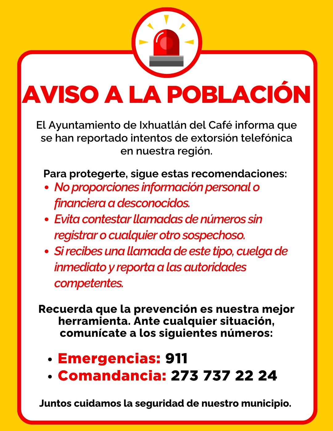 🚨 ¡Atención, ciudadanía de Ixhuatlán del Café! 🚨 El Ayuntamiento informa que se han detectado intentos de extorsión telefónica en la región. ...